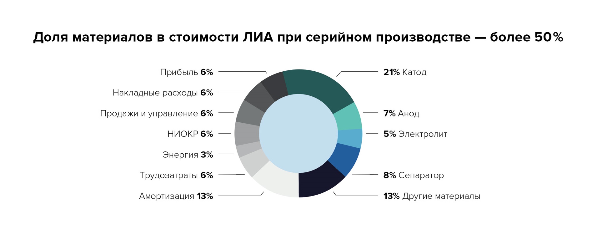 В современном аккумуляторе представлено все разнообразие химии сегодняшнего дня. Это неорганическая химия (катоды), полимерные связующие, анодный графит (углеродный материал), сепараторы. Очень важный компонент — электролит, как правило, это органический растворитель. Наконец, важны добавки, которые обеспечивают работу этого аккумулятора. В себестоимости аккумулятора материалы составляют не менее 50%, и наиболее дорогостоящий — это катодный материал, который содержит литий. И я считаю, что одна из наиболее серьезных проблем сейчас — это производство материалов для обеспечения гигафабрик. Например, две гигафабрики «Росатома» на 8 ГВт·ч потребуют порядка 12 тыс. тонн катодного материала.