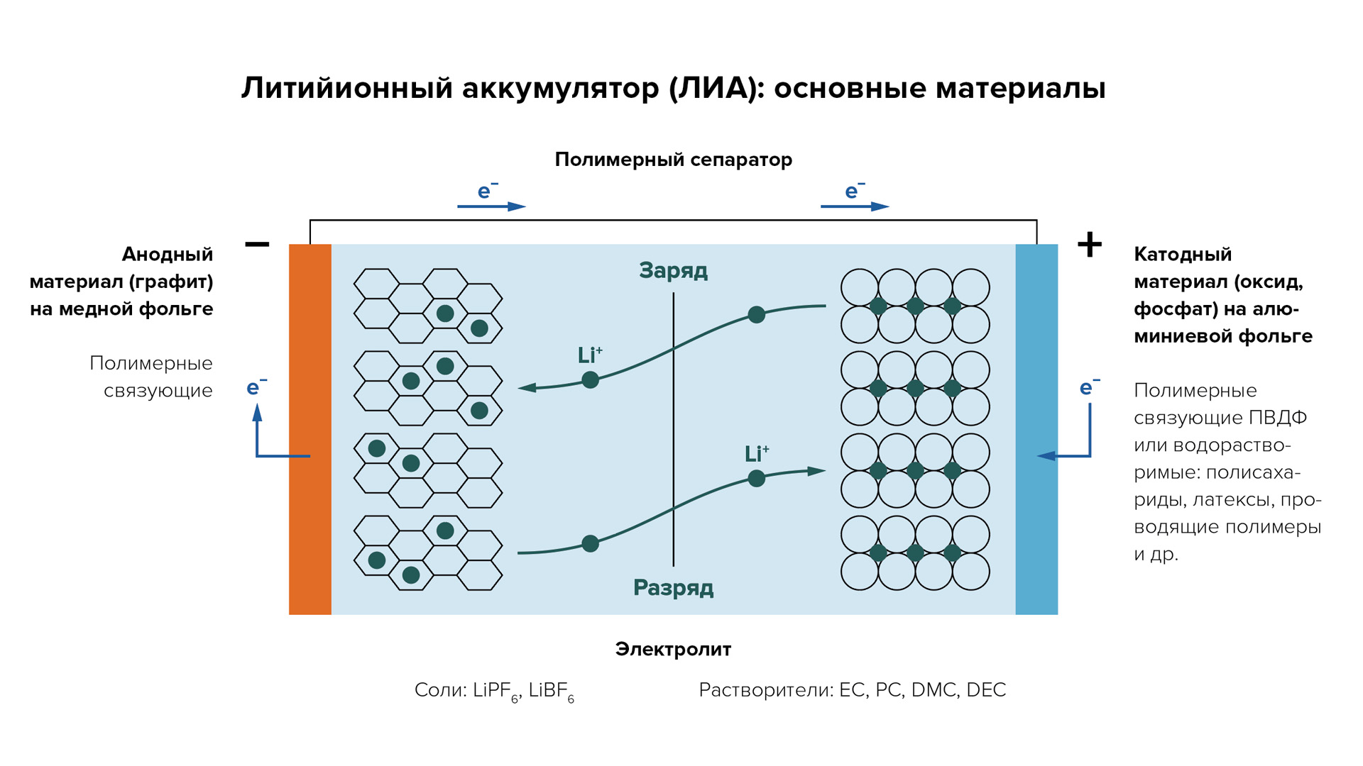 Наиболее сложные проблемы — это состав электролита. Электролит, как кровь в организме, обеспечивает функционирование всего аккумулятора. Для электролитов используются алкилкарбонаты, потому что они обладают широким окном термодинамической устойчивости к окислению и восстановлению.