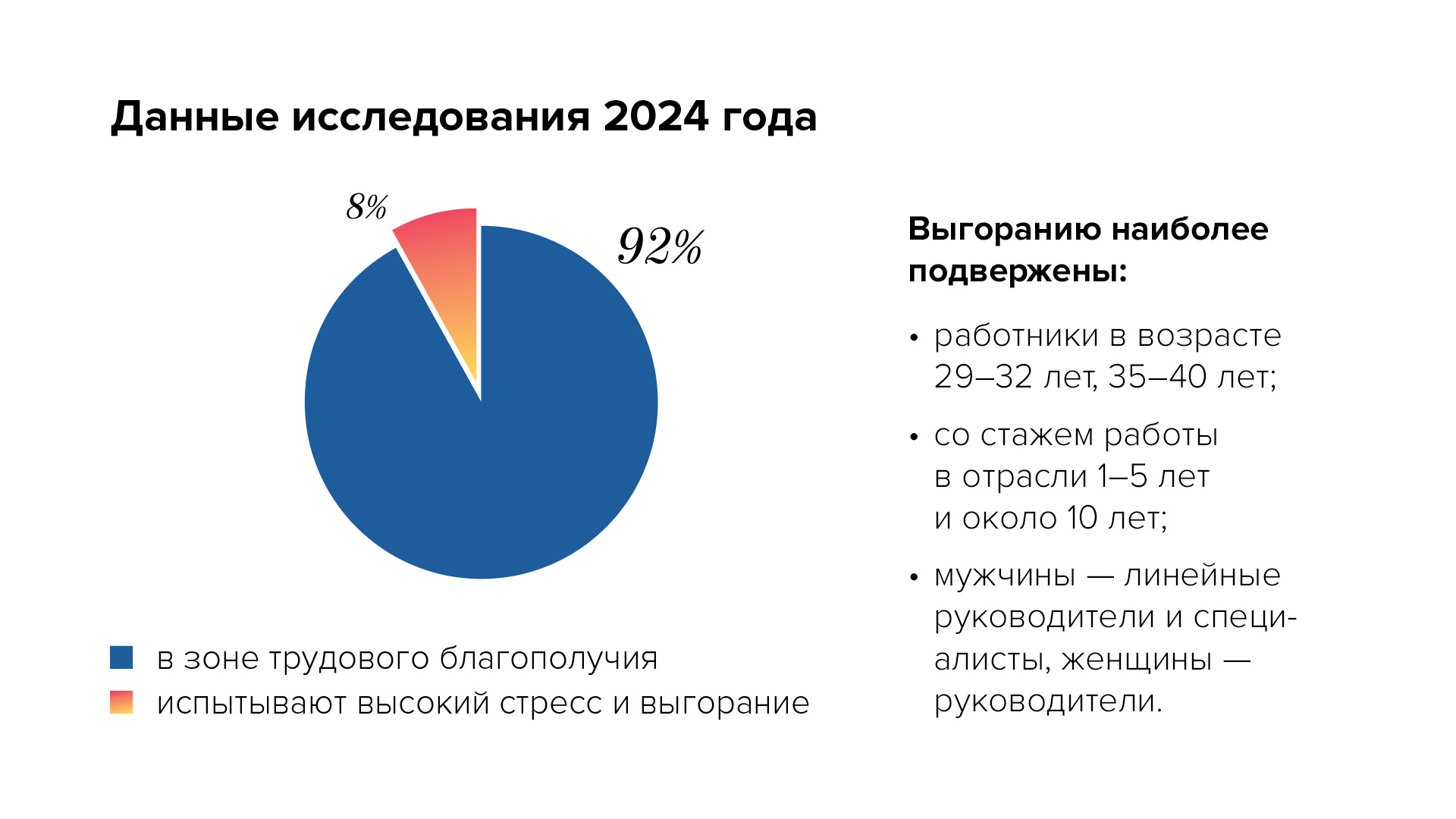 В 2024 году мы провели масштабное исследование, в рамках которого выявили основные источники стресса и причины выгорания. Мы учли факторы стресса как со стороны организации, так и личные, потому что нельзя исключать общий фон. В 2024 году социально-экономическая и политическая обстановка воздействовала на людей сильнее, чем любые организационные факторы.